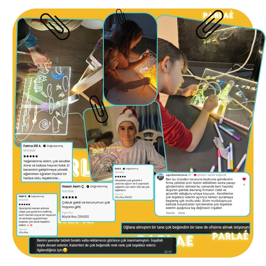 GlowArt LED Çizim Tableti ile çocukların hayal gücünün nasıl parladığını kendi gözlerinizle görün. Ekransız, ışıklı ve eğlenceli çizim deneyimi sayesinde hem yaratıcı zaman geçiriyorlar hem de saatlerce oyalanıyorlar. Siz de bu renkli dünyaya katılın!